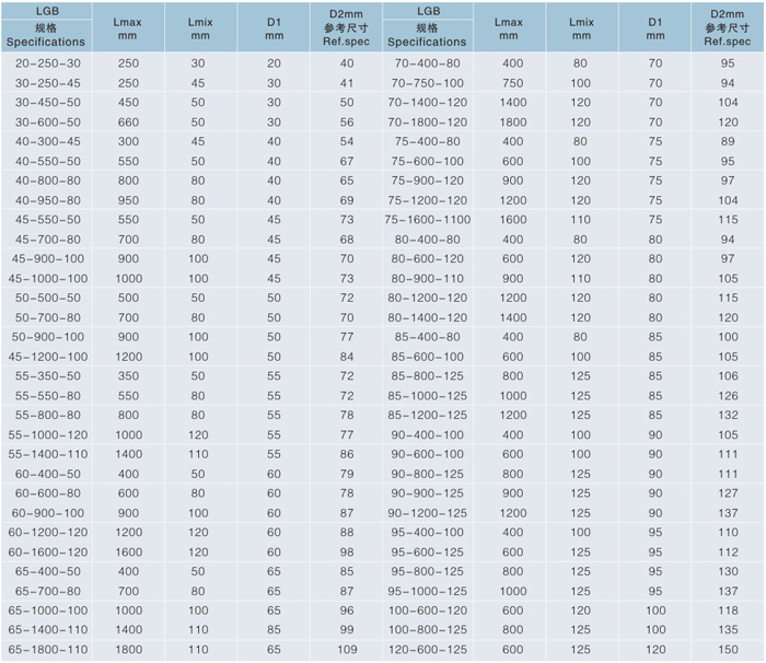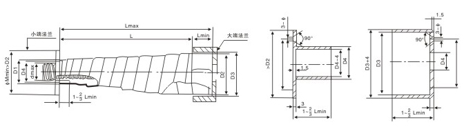 D1-保護套小端內徑=dmaz+10毫米 D2-保護套大端內徑 D3-大端法蘭內徑=D2+6~8毫米 D4-小端法蘭外徑=D1-1~2毫米 dmax-被保護零件的較大直徑 Lmin-較小壓縮長度 Lmax-較大延伸長度 L-較大允許行程